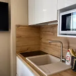 Eine voll ausgestattete Küchenzeile in den Stadio Apartments Shkoder bietet einen Herd und einen Geschirrspüler. Dieses Apartment ist nur wenige Schritte entfernt von der nächstgelegenen Bushaltestelle to Puke.